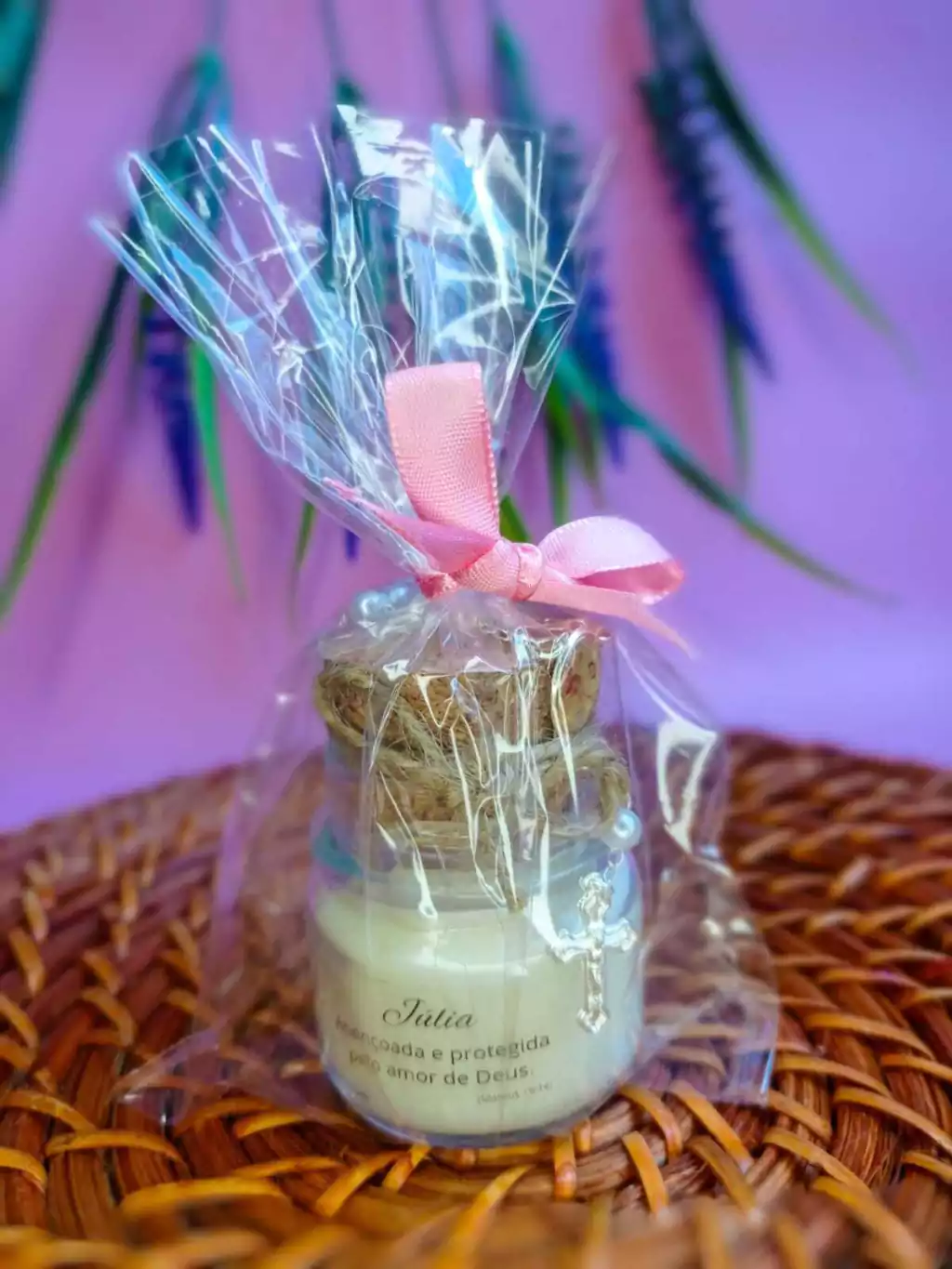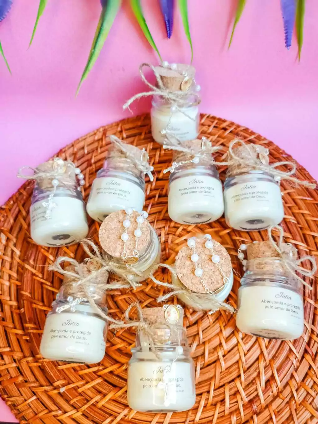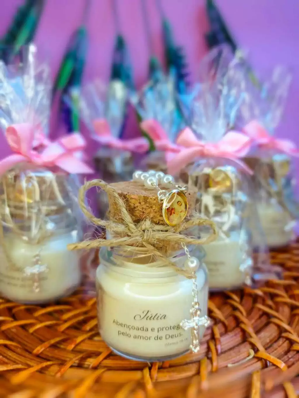 Feita artesanalmente em pote de vidro com rolha, você escolhe cada detalhe: aroma, cor, frase no rótulo e os acessórios delicados que representam sua ocasião — seja um batizado, casamento, aniversário ou qualquer celebração que mereça luz e afeto.
